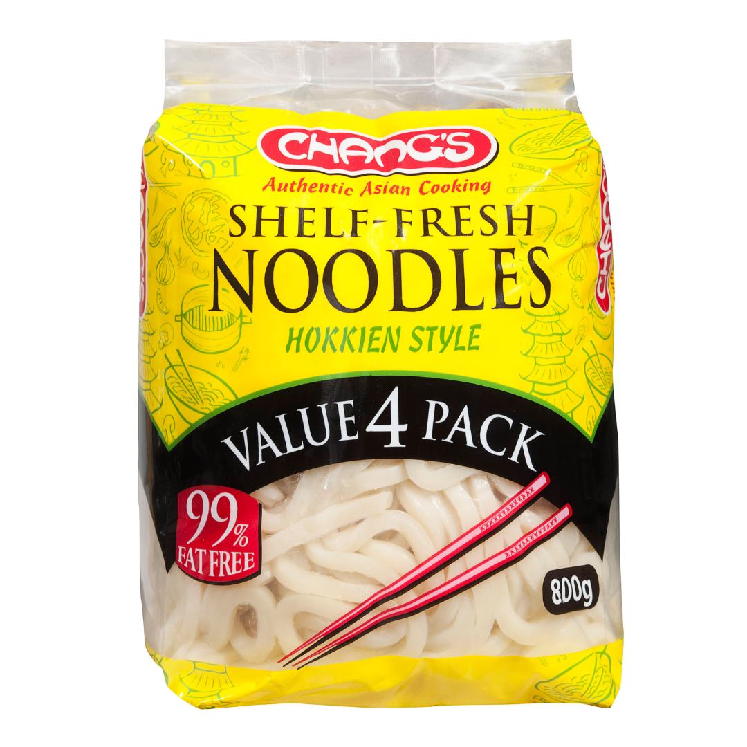 Chang Shelf Fresh Noodles Hokkien Style 800g Shelf Fresh Noodles Hokkien Style 800g The Hokkien noodles is a classic restaurant-style noodle that is cooked in your kitchen in its fresh state, thick, chewable, and abundant in body. They are freshly packed and full of flavour and can be used in noodle stir-fries, soups or in the hearty Asian dishes.