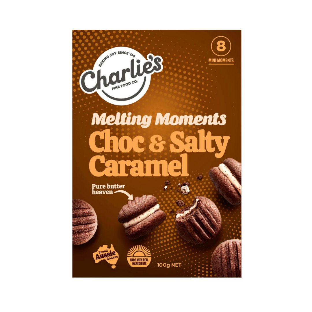 CHARLIES FINE FOODS CHOCOLATE & SALTY CARAMEL MELTING MOMENTS 100G