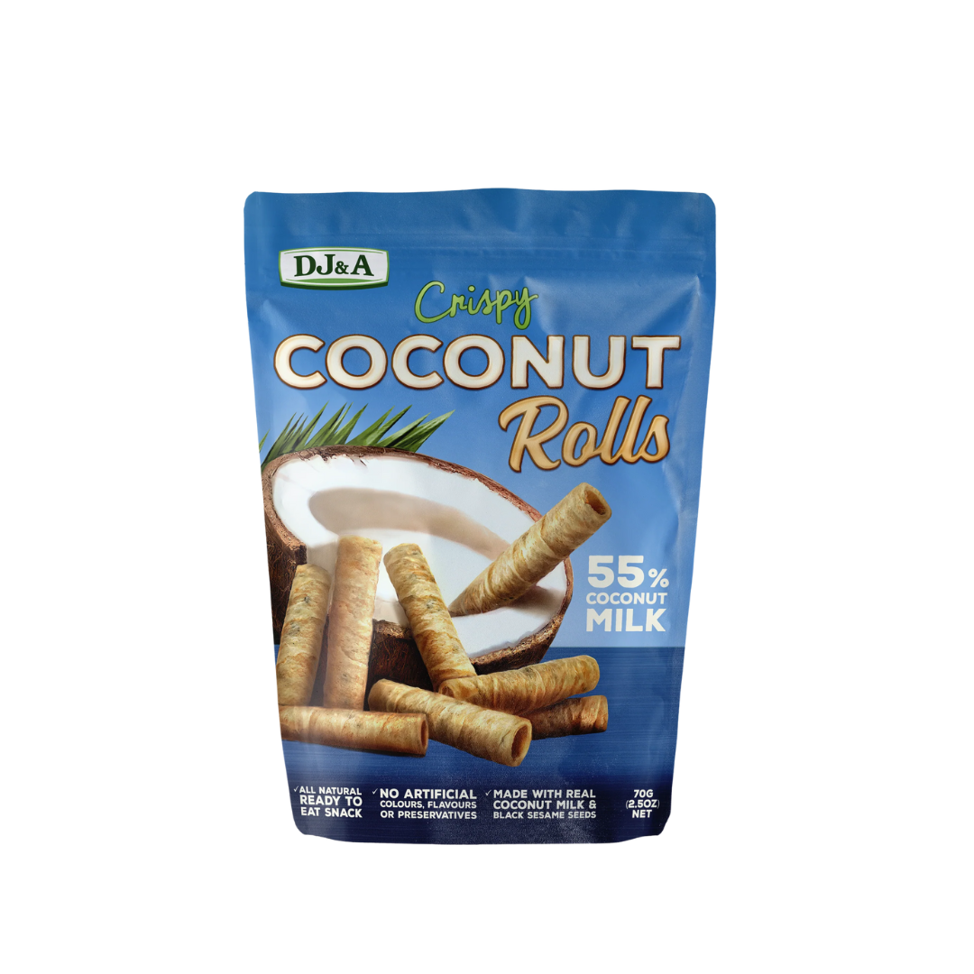 DJ&A Crispy Coconut Rolls are the perfect bite-sized treat made with real coconut cream. These are thin, tasty, crispy baked rolls that are sweet, crunchy, and rich in coconut taste. They are a snack that is very addictive and can be used with tea, coffee, or by itself.