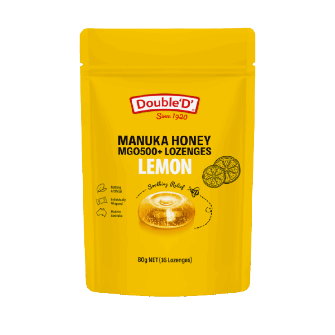 Honey Manuka, Double D Manuka Honey MGO500+ Lozenges Lemon is a combination of genuine New Zealand Manuka honey with a natural lemon zest, which is soothing and has natural calming effects. It is ideal to use in soothing sore throats or just to freshen the mouth.