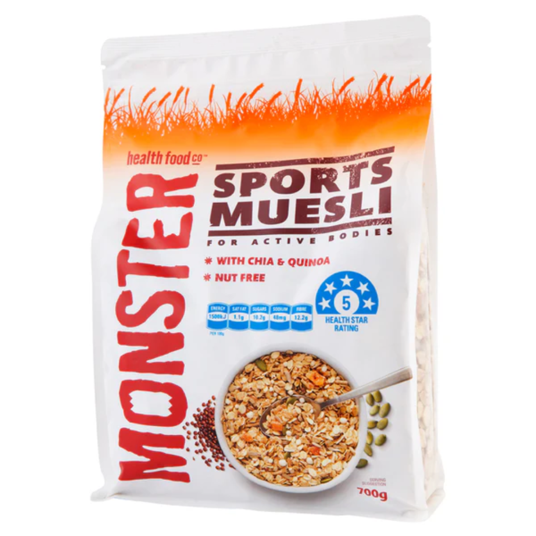 Monster Sports Muesli contains a rich blend of grains providing complex carbohydrates for sustained energy, complemented by seeds that supply protein. Enhanced with Quinoa, Chia, and Lupin, it offers increased iron, protein, and fiber content. Lightly sweetened with golden syrup, this nut-free muesli delivers natural flavor while supporting a balanced and nutritious start to your day. Designed to meet the demands of active lifestyles, it combines health benefits with excellent taste.