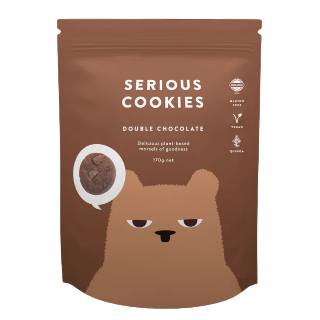 The Serious (GF) Double Choc-Chip Cookies 170gm are a chocolate lover's dream -- rich cocoa cookie dough studded with generous dark chocolate chips. These cookies are gluten-free, but provide an intense and rich chocolate experience with a pleasingly soft crunch. Perfect to go with coffee, tea or with a moment of literal sweet escapism.