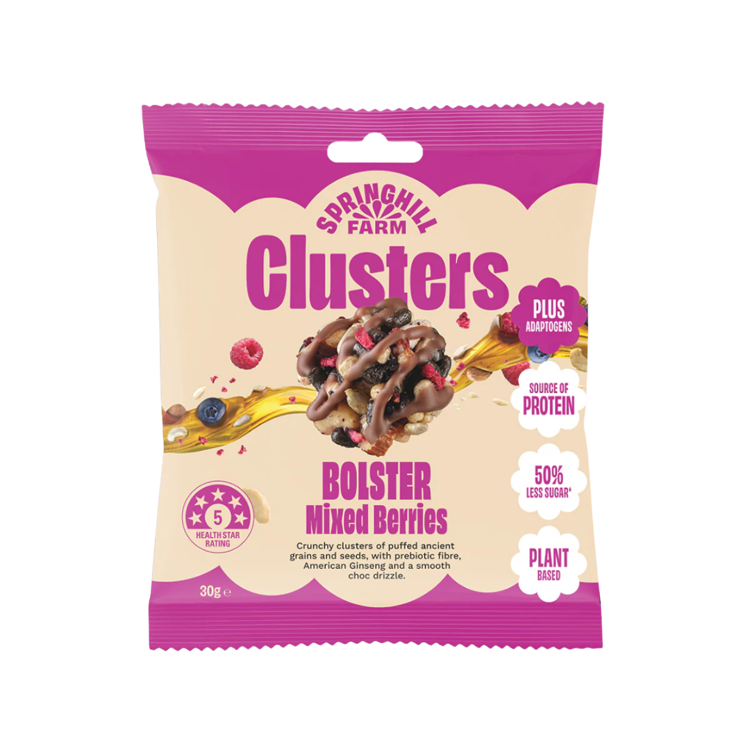 Energize your day with Springhill Farm Boodles Healthy Clusters – a crisp blend of mixed berries, seeds, and grains, held together by fibre syrup and topped with a smooth chocolate drizzle. Enriched with adaptogens, this nutrient-dense snack supports your body’s vitality and sustains your energy throughout the day.