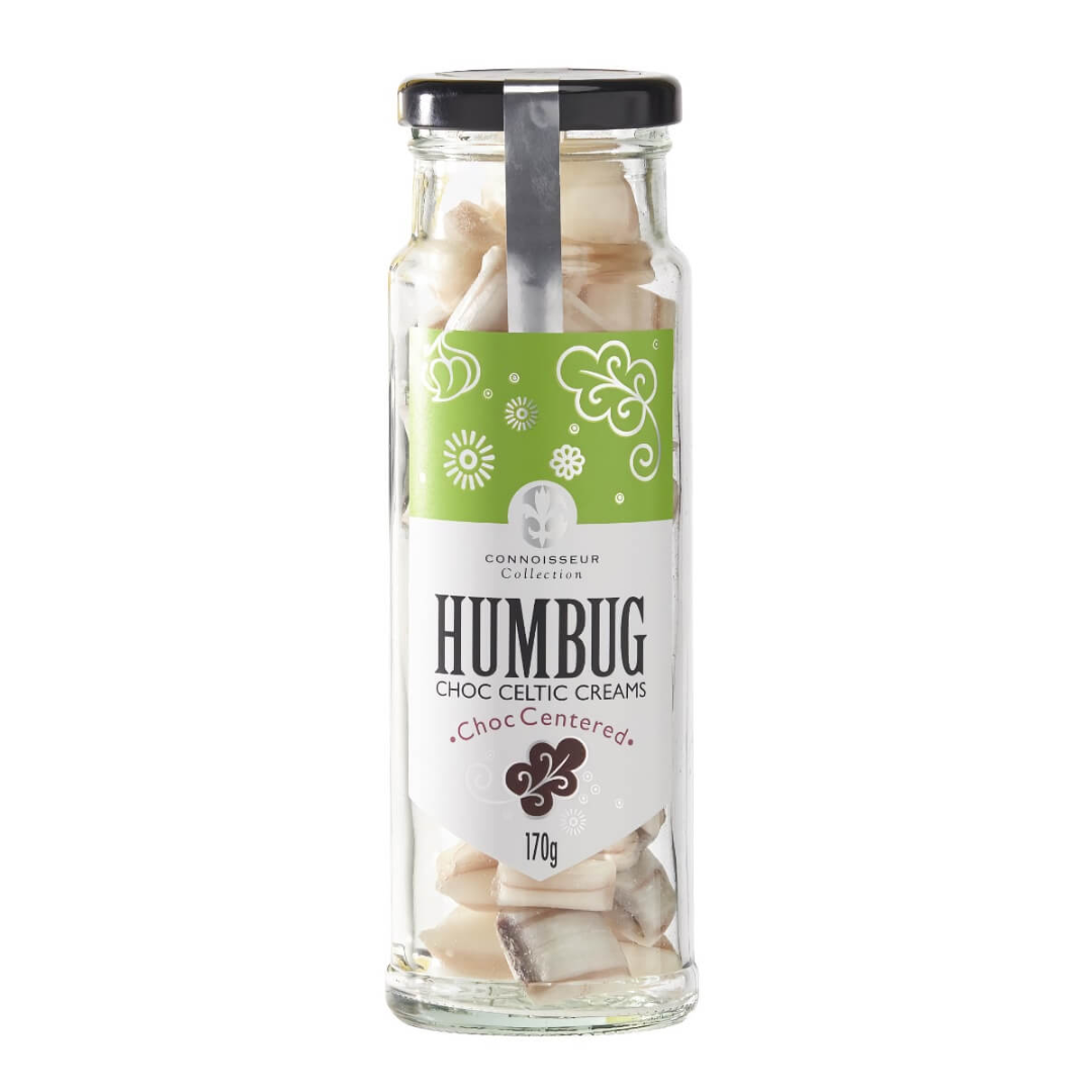 Delight in expertly crafted Celtic cream humbugs with a rich chocolate center, elegantly presented in sparkling glass jars.