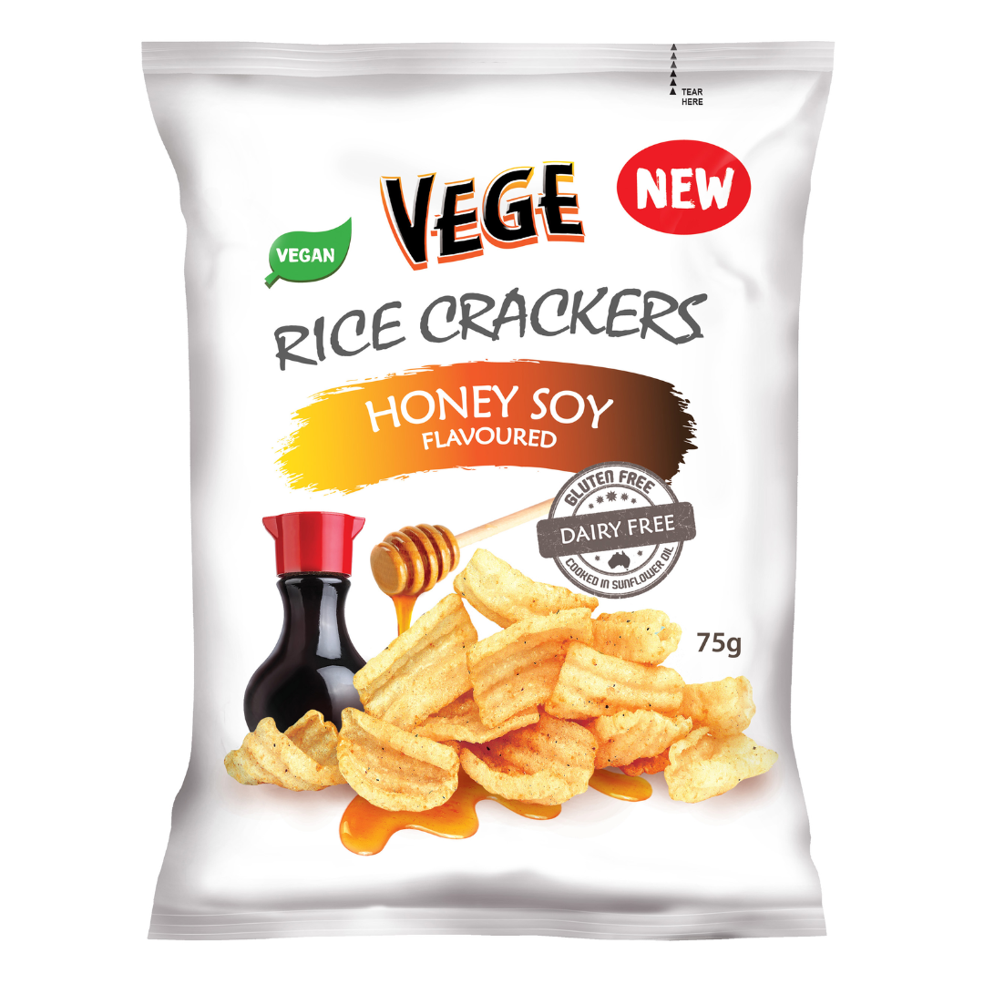 Crafted from rice flour and tapioca, these dairy-free crackers offer a delicate, melt-in-the-mouth texture. They are coated with a distinctive vegan Honey Soy flavor that contains no dairy, honey, or soy, providing a unique and flavorful snack option. Perfect for enjoying between meals or as a savory pre-lunch or pre-dinner treat.