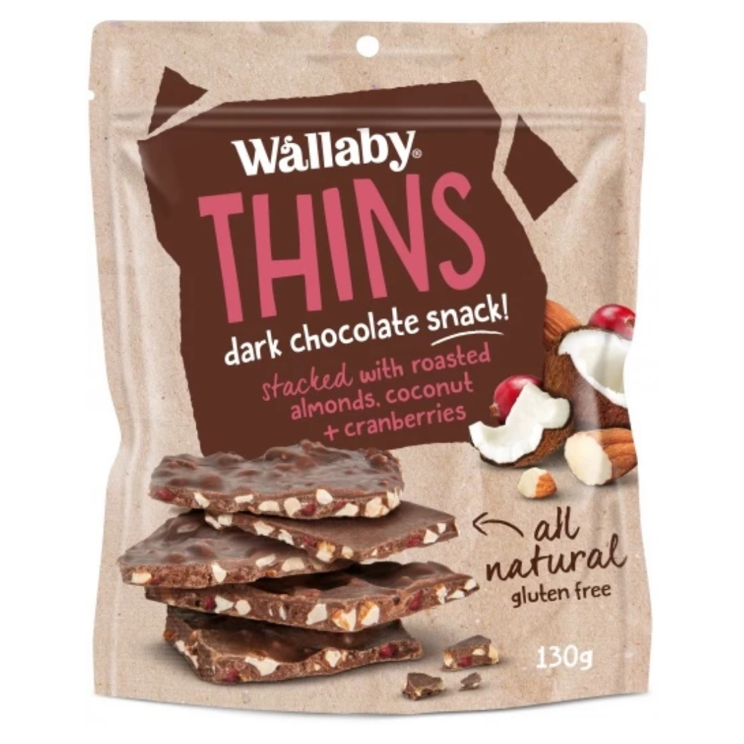 Wallaby Thins Dark Chocolate Snack with Roasted Almonds,Coconut & Cranberries G/F 130g
