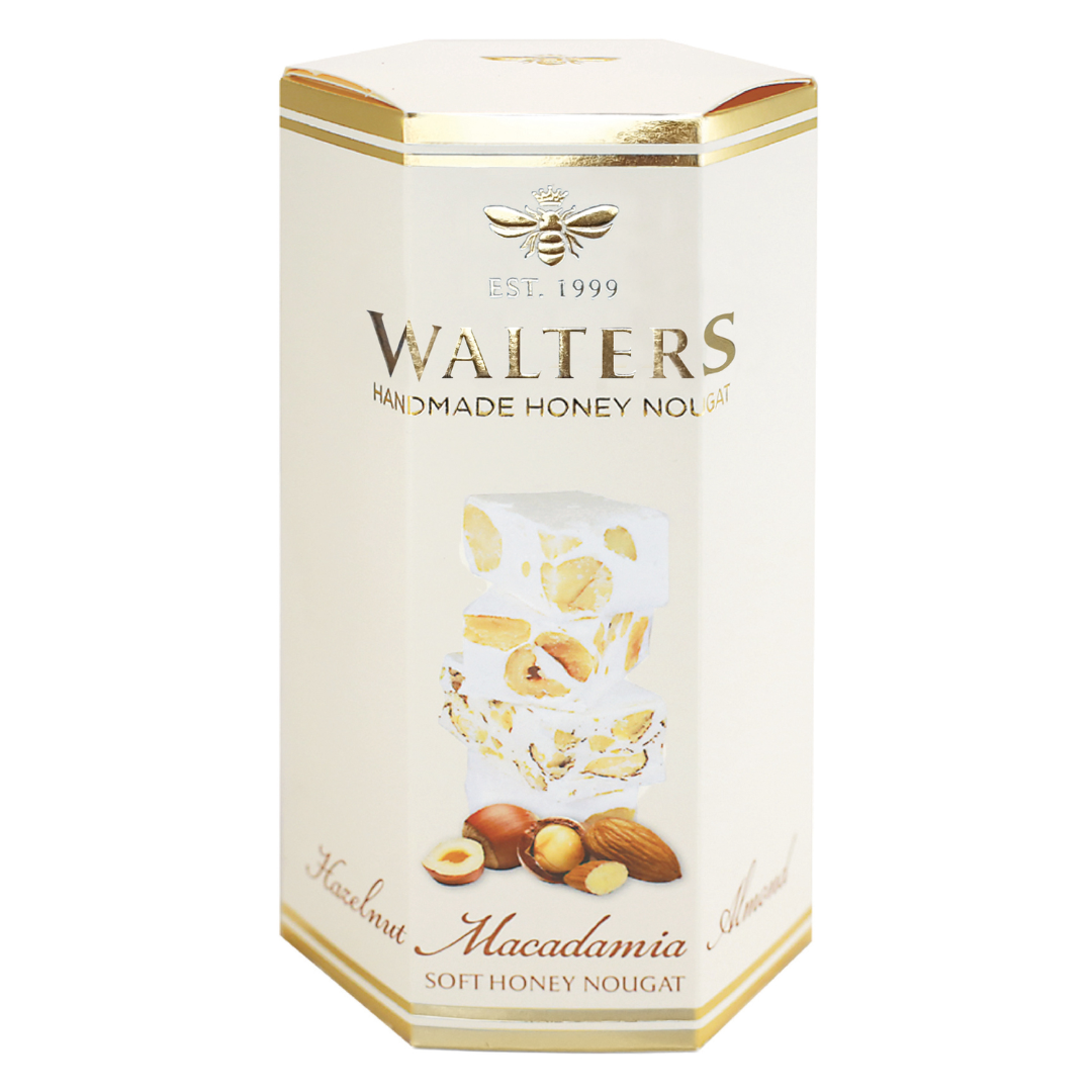 This premium gift box features a selection of bite-sized nougat bonbons, including Hazelnut, Macadamia, and Almond varieties.