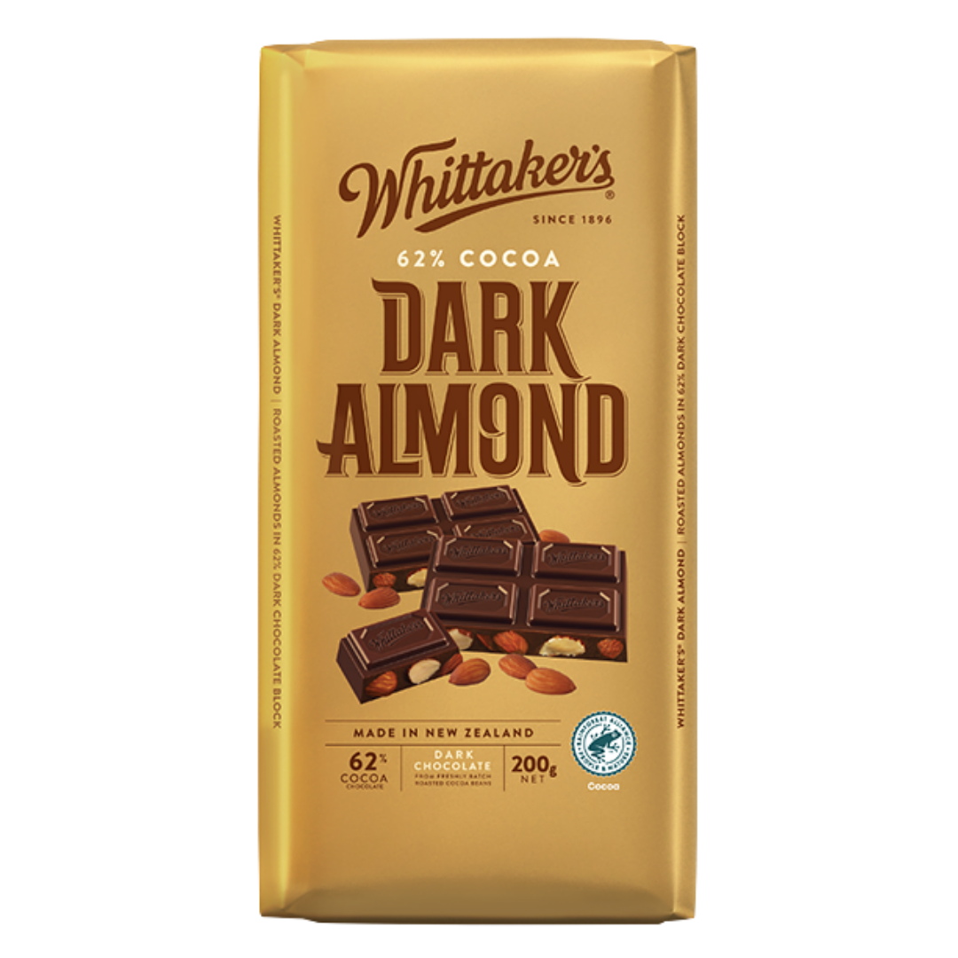 Savour the bold, nut-rich balance of Whittaker's 62% Dark Almond, a smooth, modern twist on classic dark chocolate.